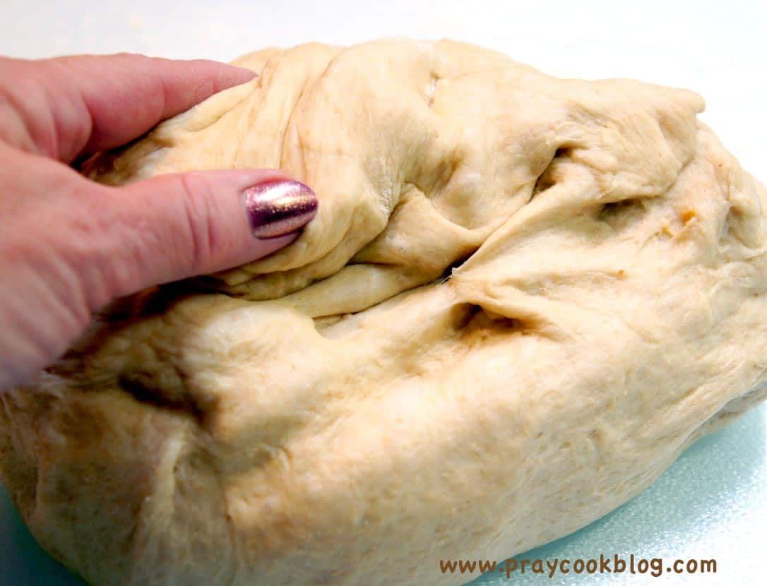 No Way! This is yeast bread … it has to rise and rest, and rise, and be punched down — or does it? I chose to mix this dough in my bread machine on the “dough” setting. I put the ingredients in and let it go as it mixed and kneaded. This can also be done in a Kitchen Aid or by hand.