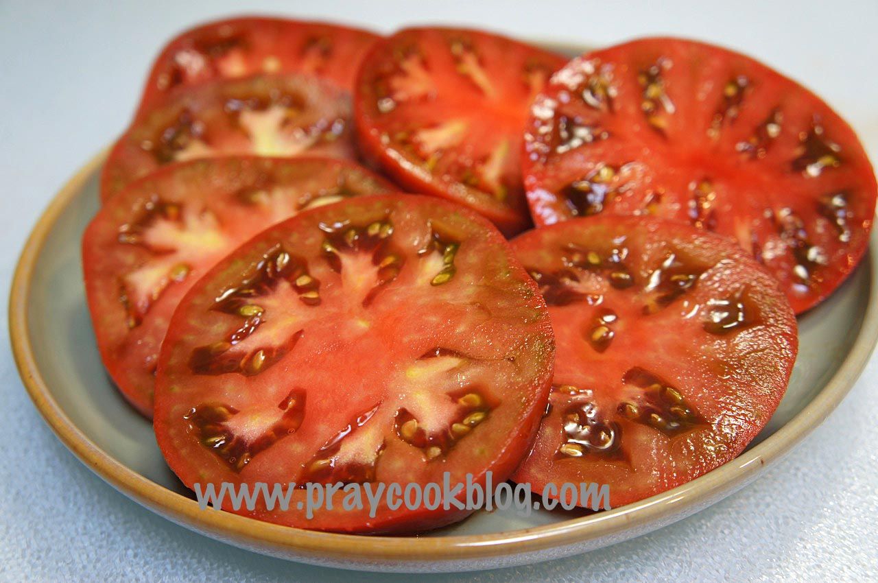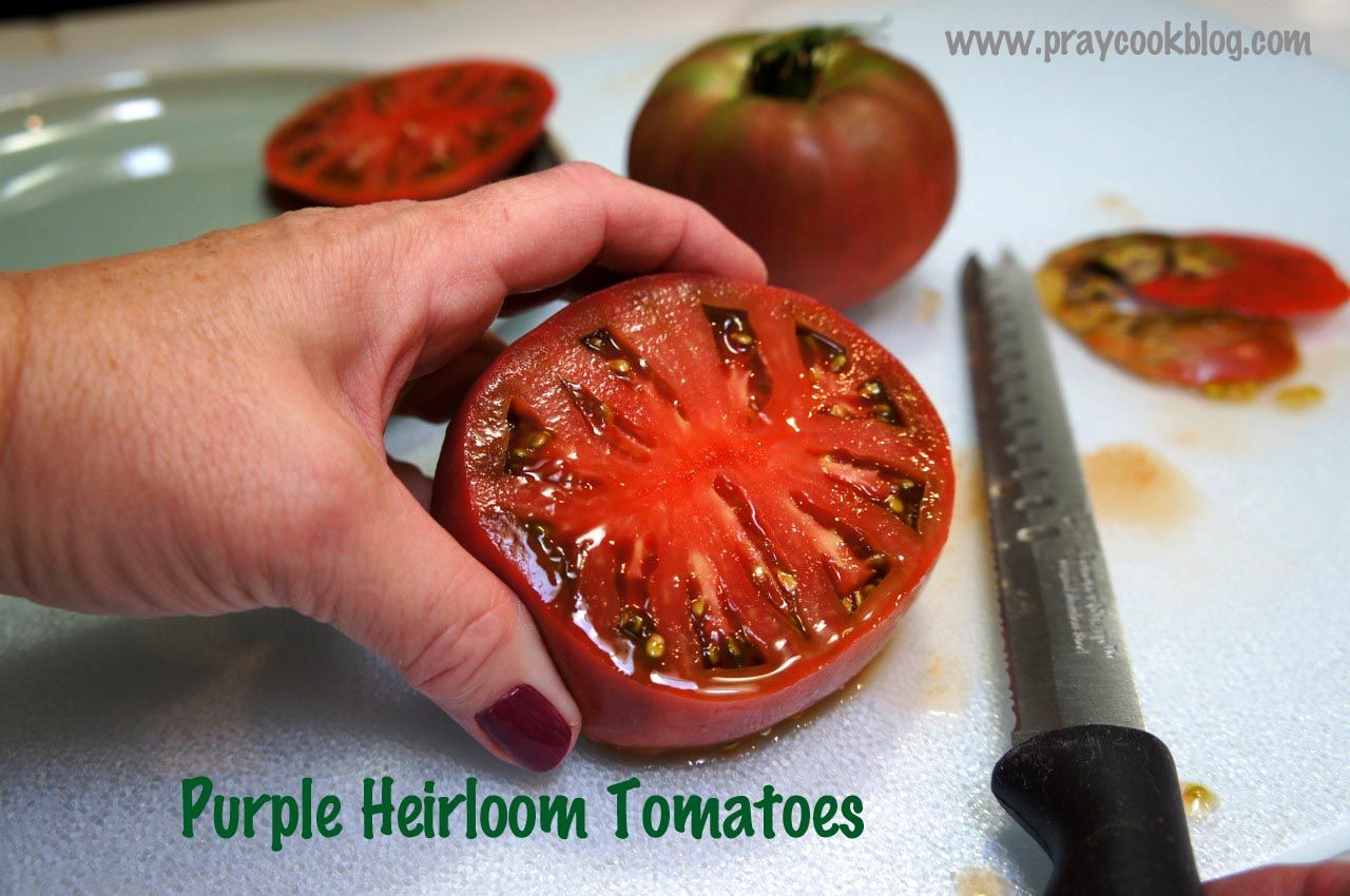 Just from one slice you can easily see the juice of this tomato. Heirlooms are mostly only found locally. Because they are not hybrid tomatoes the skin is thinner than the skin of hot-house tomatoes making transporting them more difficult. They also have a shorter shelf life of 3 to 5 days, unlike hot-house tomatoes that are picked green, shipped and sometimes not eaten for 3 to 4 weeks!
