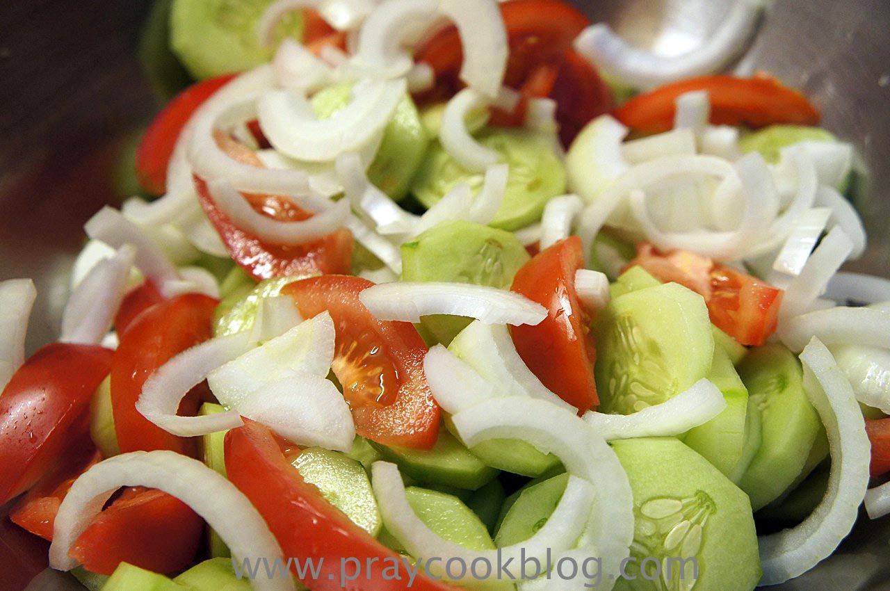After soaking the cucs I tossed them with the tomatoes and sweet onions. Aren’t they pretty?