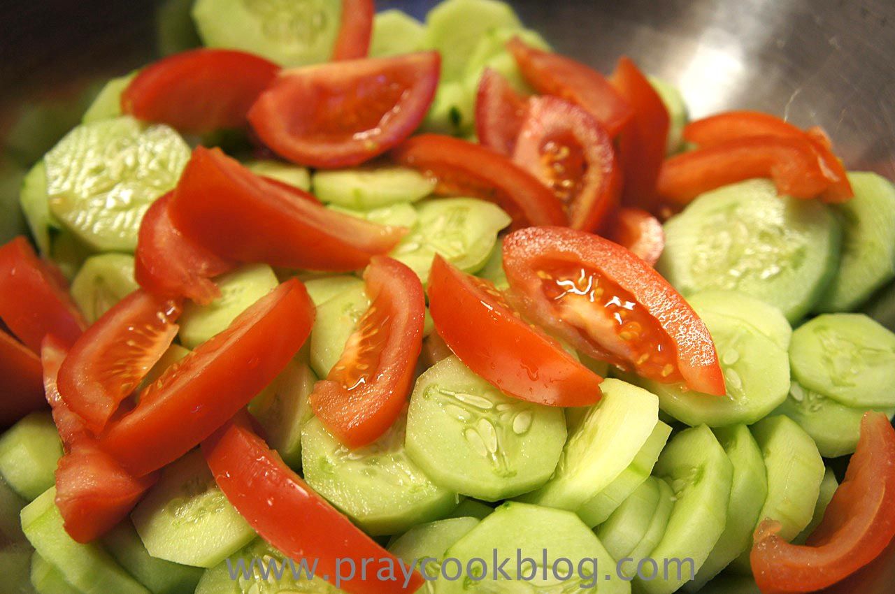 Before our tomatoes ripened I purchased these “vine-ripened” tomatoes to make this cucumber tomato salad. Our garden cucumbers were growing crazy but the tomatoes weren’t quite ready. Even then, this salad turned out to be one of the best we have had this summer. My sous-chef dish-washing mom loves cucumbers but they don’t always love her. However, when I soak them in salt water for several hours first, she is able to eat them with no problem.