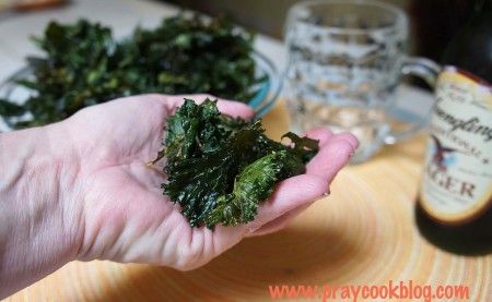 After the oil and seasoning the pieces of kale are placed in a layer on a cookie sheet and baked. Baking time varies depending on how big you leave your pieces of kale. I made mine kinda small and next time I am going to leave them in a bigger chunk, but still removing the stem. They are baked until the edges are just a little brown, the middle is still green and the kale has turned crispy, about 5 to 8 minutes at 400 degrees. Several bloggers mentioned they are great with beer! Who am I to argue?