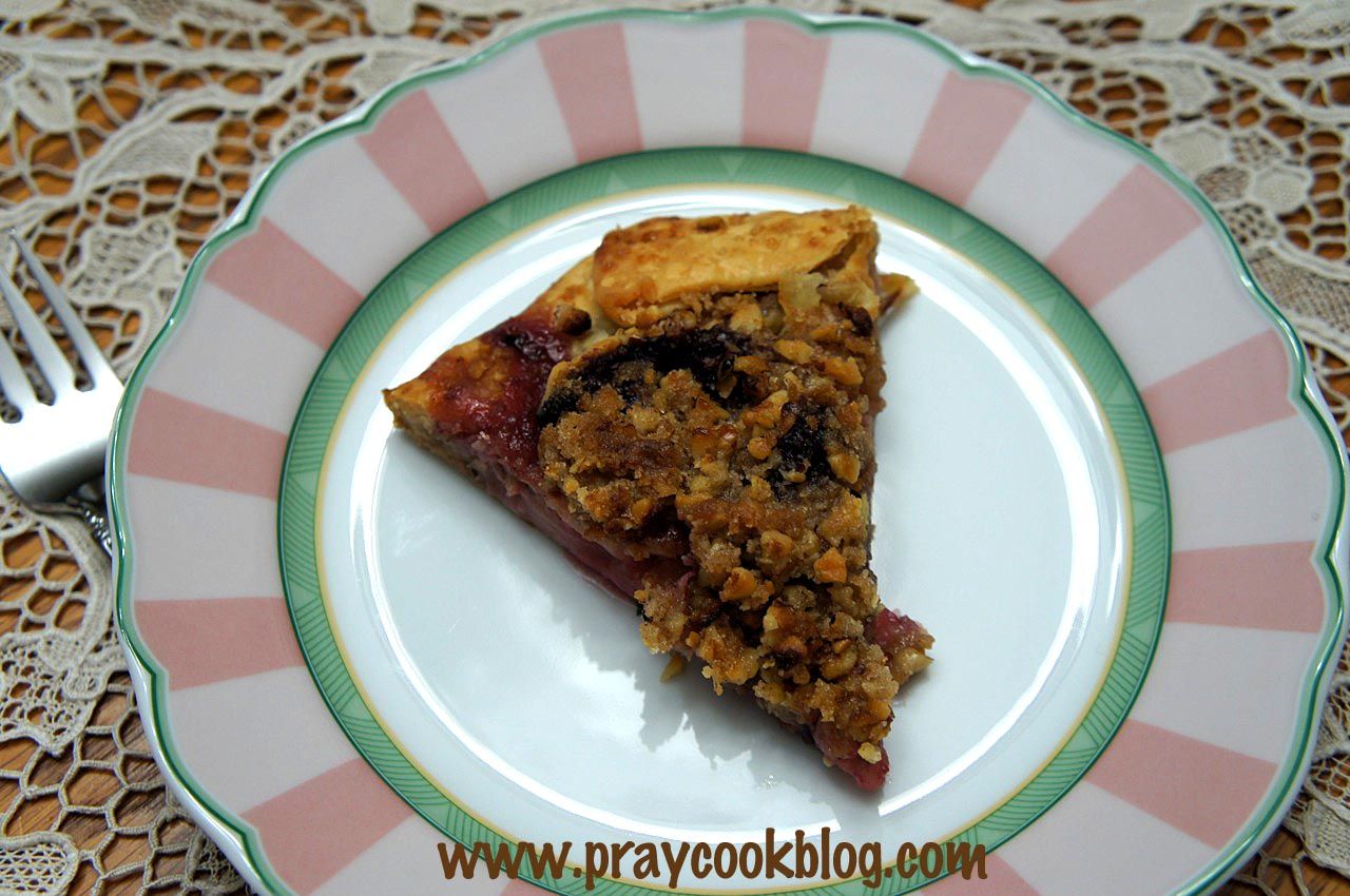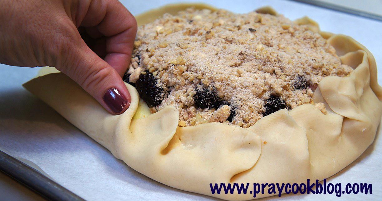This is an “open-face” pie of sorts. The crust is turned up around the filling forming this pocket. I crumbled my topping in a food processor so it was quite fine. I liked the over-all look and texture after baking.
