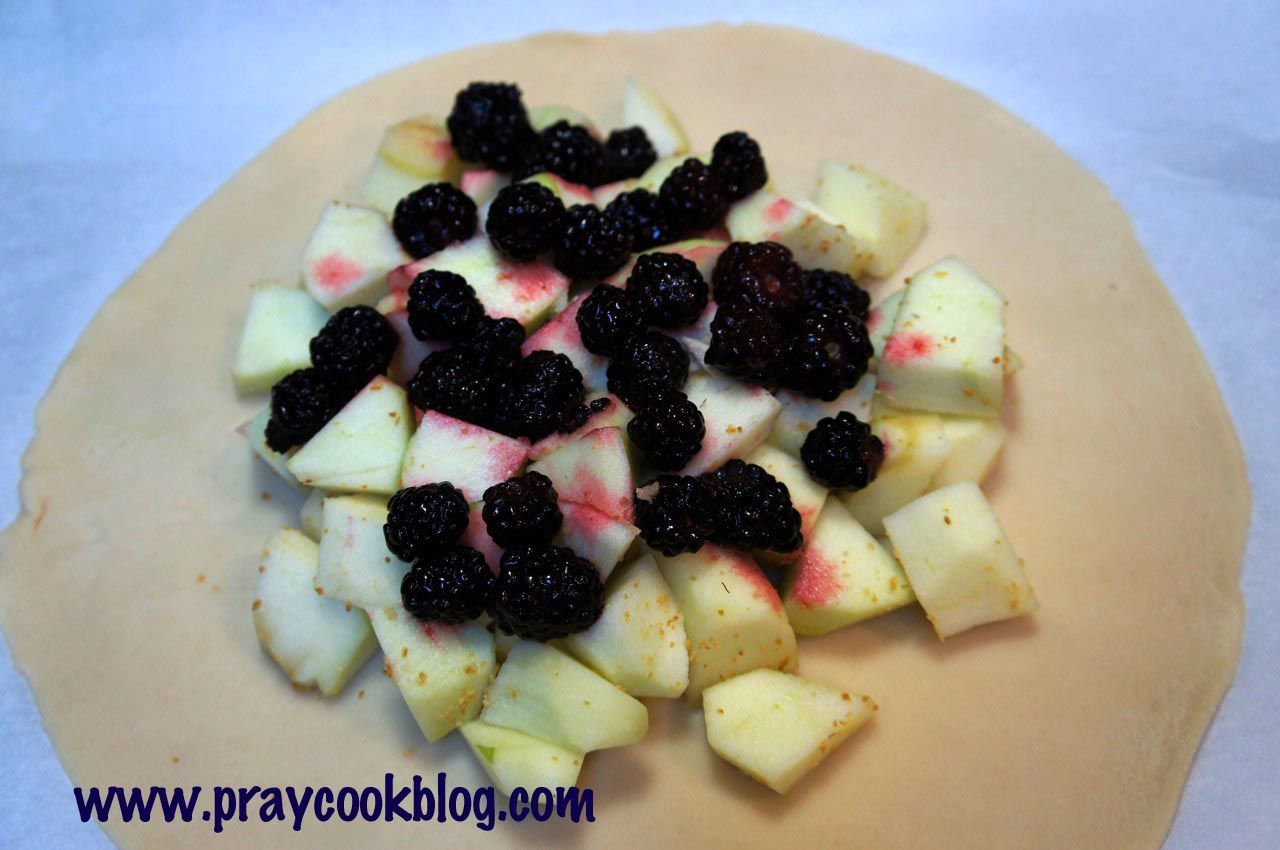 I would have made a pie crust according to Carmen’s recipe, but I had a Pillsbury crust in the frig that needed to be used 🙂 I chopped my apples fairly large and was worried about that while it was baking. Turns out I need not worried, they baked perfectly. I sprinkled the apples with juicy, plump blackberries.