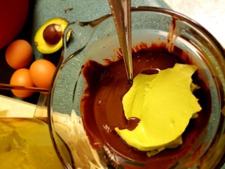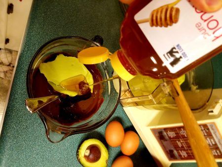 - Stir one cup avocado, ½ cup honey, and vanilla into the cooled chocolate.