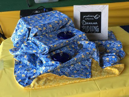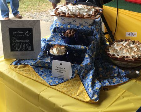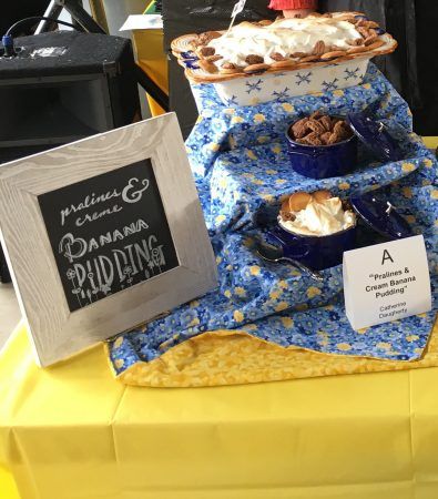 Fast forward one hour. Two puddings were done, layered with bananas, Nilla wafers, pecan pralines, topped with meringue and baked. I was given table space to display them. I had designed my space to hopefully grab some attention. The clock ticked, the bell rang. It was over.