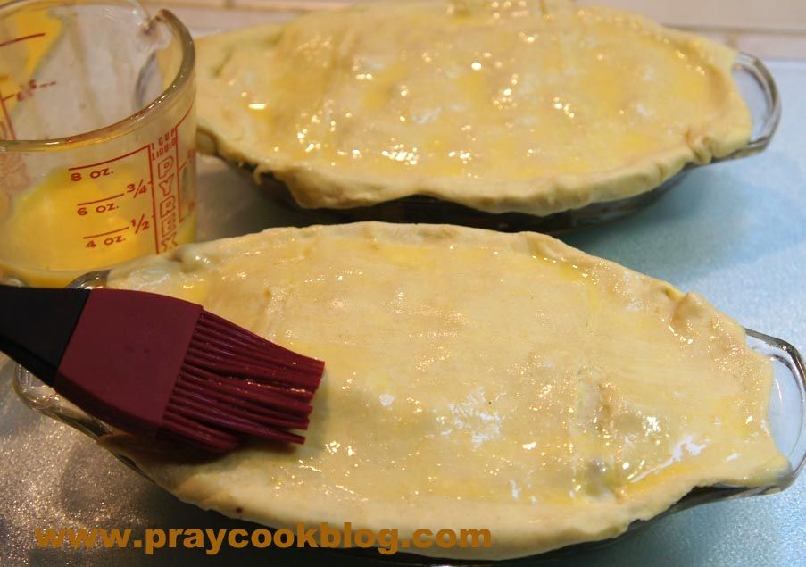 Just when you think this can’t get any better, the puff pastry comes to life. I buy Pepperidge Farm Puff Pastry and this recipe uses just one sheet. I divided it in two and carefully stretched it across the pot pies, leaving a little extra around the edges. I had a few extra pieces left over and I used a little cookie cutter and just placed them on top. An egg wash really browns up the pastry as it cooks. Without my dish-washing mom, any entrée I can make and eat out of the same dish is a winner. Did I mention — please hurry home mom! 🙂