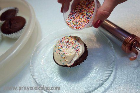 Once the cupcakes are removed from the freezer the wrapping needs to come off and they need to be thawed on the counter at room temperature for about 1 to 1 1/2 hours. If the wrapping is allowed to stay on while thawing this allows condensation to form between the wrapper and the tops, which turns gooey.