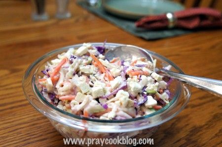 - In a separate bowl, whisk together the mayo, vinegar, honey, salt, and pepper. Gently toss over the coleslaw mixture. Cover and refrigerate at least 30 minutes before serving.