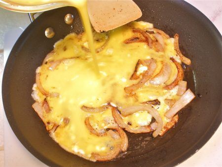 - In a small bowl, whisk together 2 teaspoons of sour cream and eggs. Mix well. Add eggs to cooked onions. Cook and stir over medium heat until completely set.