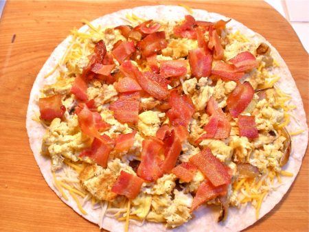 - Layer tortilla as follows: cheese, scrambled eggs, crumbled bacon, cheese and top with tortilla.