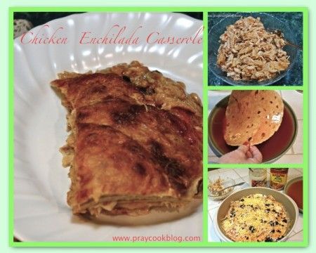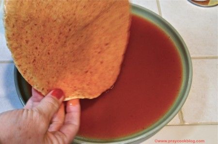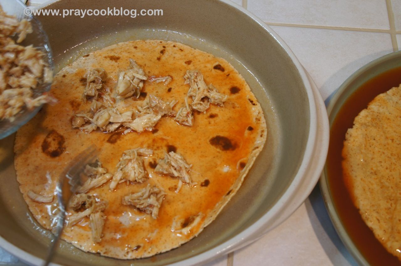 - Pour Enchilada sauce onto a large plate. Dip tortilla on both sides and place in the bottom of a greased baking dish. Dish can be round, square or oblong. A 9" round or 8"x8" square pan or even an 8" x 11" pan works fine. Just cut tortilla to fit if necessary.