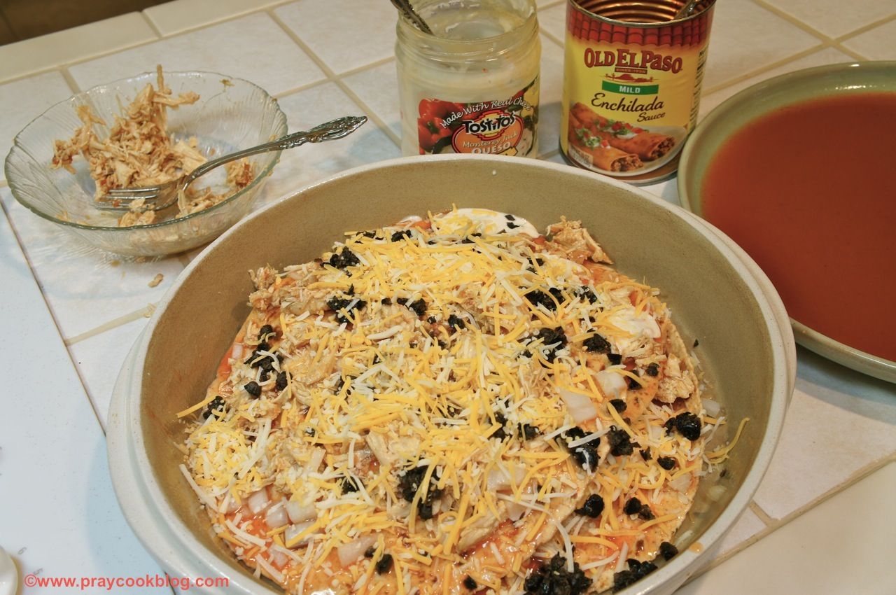- Layer sauced tortilla, sprinkle with chicken, black olives, finely chopped onion and cheese. Continue to layer until the baking dish is nearly full or all ingredients used up!