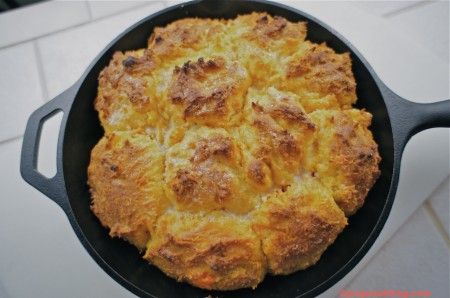 - Once a uniform dough has formed, pinch off small balls and place them in a ring around the edge of the prepared pan. Place two final biscuits in the center. The edges of the biscuits can be touching the pan. Place the entire pan in the oven and bake for 17 minutes. Remove, brush generously with melted butter and bake for an additional 2 minutes.
