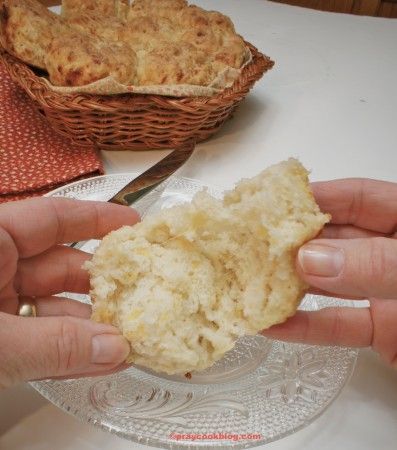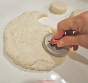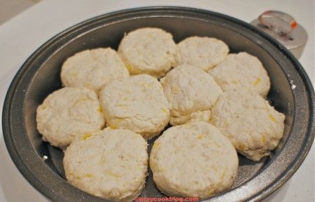 - Cut in shortening, add cheddar cheese, mix lightly and turn out onto floured board. Using a biscuit cutter, cut biscuits and place in prepared baking pan.
