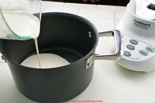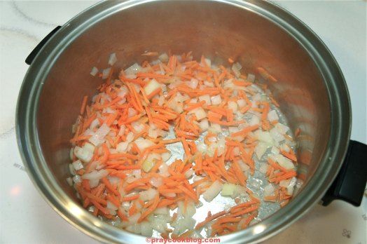 It’s so easy, just crumble tofu in the blender, I added chicken broth as the liquid medium, and blend! It pours out just like cream. As a matter of fact my sweet mom came into the kitchen while I was cooking and asked what was in the blender. I said, “um, creammmy …” I cooked up the carrots and onions – important ingredients in this soup. Carrots sweeten it up a bit 🙂
