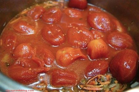 - Add basil, tomatoes and broth, saving 1 cup of broth aside. Reduce mixture and simmer 45 minutes.