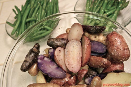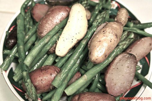- While potatoes are in the oven, steam asparagus and green beans just until tender crisp.