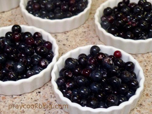 What I really like about this recipe is that it is low sugar and high on berry flavor. I started with the berries, a little corn starch and a little white sugar mixed together and spooned into the bottom of these little glass tart dishes.