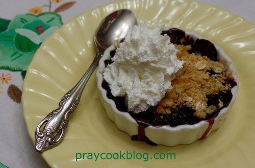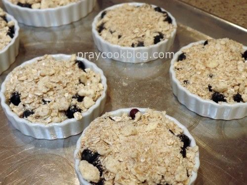 - In a small bowl mix flour, oats, brown sugar; cut in butter until crumbly. Sprinkle over blueberries distributing evenly between 6 dishes.
