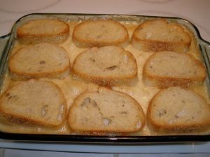 ** During the 4th of July weekend I remade this wonderful recipe, but instead of the sliced baguettes, I used 2 cups of torn up pieces of bread (any kind will due) sprinkled with the melted garlic butter. This made a wonderfully crispy, tasty, brown top while making it easy to dish out the onions instead of a whole piece of bread with each serving.