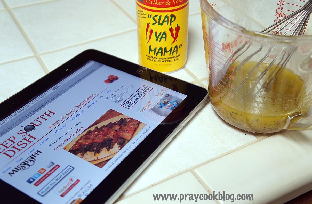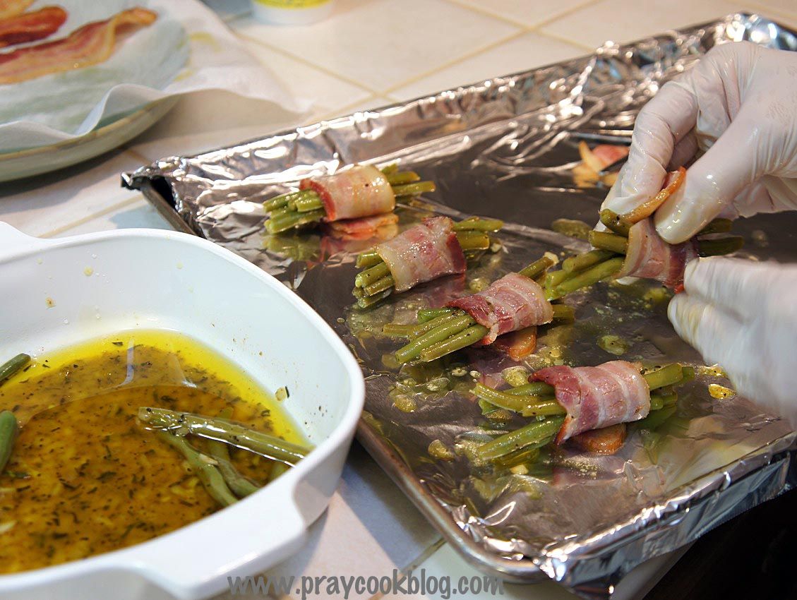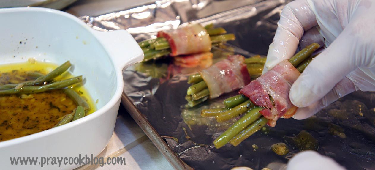 What is it about green beans and bacon? My first memories of mom cooking green beans is with bacon sprinkled around the top and simmering right along with the pot of beans. Yum! A few weeks back I was visiting Deep South Dish, one of my favorite blog websites. Mary was blogging about Green Bean Bundles, a recipe given to her by a Facebook friend. The idea of crispy bacon wrapped around a fresh-out-of-the-garden french green bean left me scrambling to the kitchen. My Chief Gardener had just brought in a mess of green beans, I had bacon in the frig and I was set to go! The recipe starts out by mixing up a vinaigrette marinade. While I have seen many versions of this recipe across the internet, Mary’s recipe called for some Cajun seasoning. A few years ago visiting friends, Don and Linda, gave us some “Slap Ya Mama” Cajun seasoning from Ville Platte, Louisiana. Perfect for the marinade! Since the vinaigrette starts out basic with olive oil, vinegar, mustard, onion, sugar, tarragon salt and pepper I think you can add your favorite Cajun seasoning or maybe another favorite flavor. These are all whisked together and set aside. The recipe calls for 1 pound of whole green beans (fresh or canned) which should result in about 12 buddies of about 6 beans each. Mary suggested 2 to 3 buddies per person. I thought, Oh my gosh, that seems like a lot per person. I “sort of” followed her advice and made 2 buddies per person — after all, they were just the side dish at dinner. WRONG! Two per person were gone in a flash and the Chief and my sous-chef dish-washing mom were looking around for MORE! Yikes! After cooking the beans in a pot of boiling water I tossed them with ice to cool and stop the cooking. We like our vegetables tender-crisp so I did not cook these more than about 7 minutes. If you like yours done a little more you should probably cook them for 10 minutes or so.