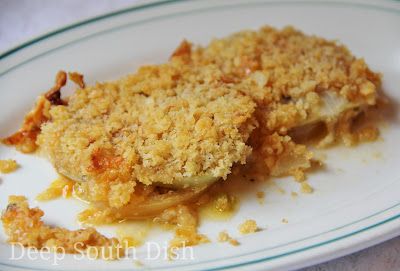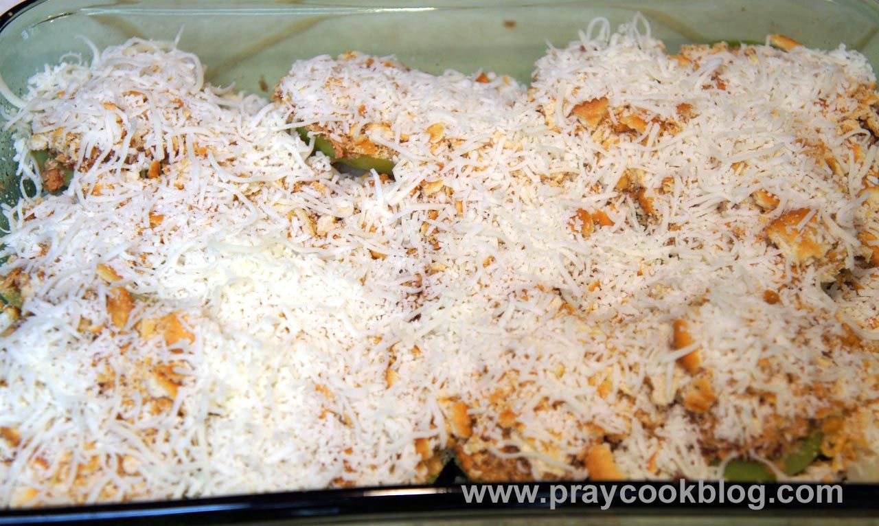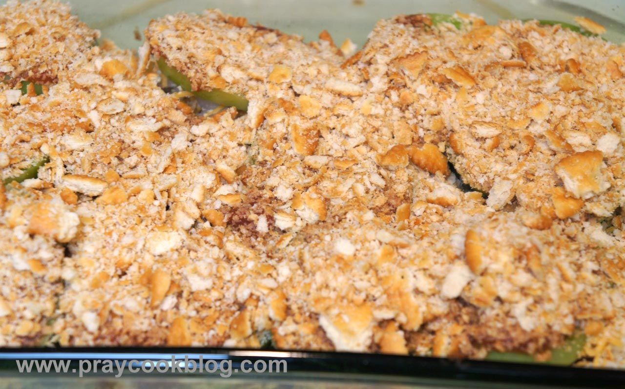 After another layering of tomatoes, seasoning and marinara, the whole thing is covered with crushed Ritz crackers. The Ritz add to the sweetness of the onions and makes for a beautiful paring.