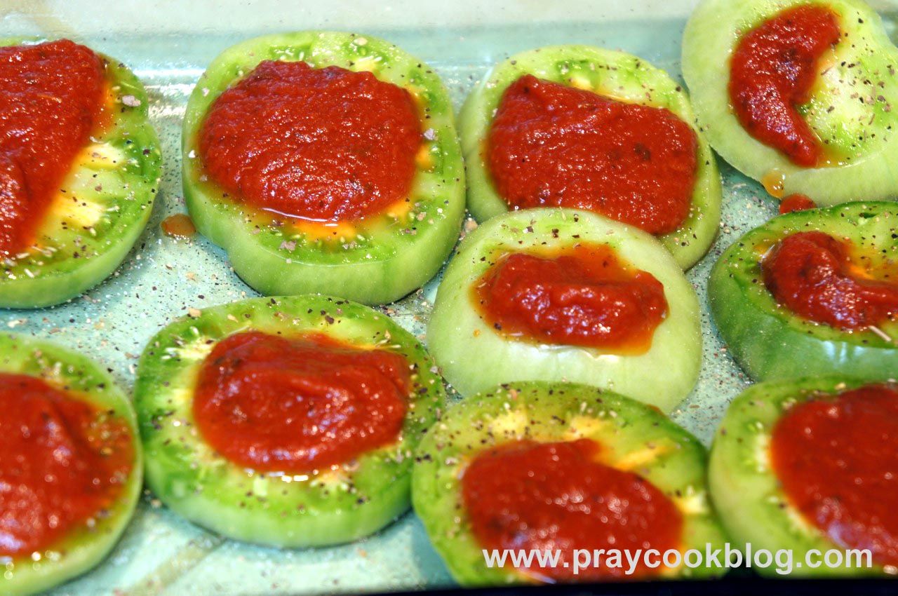 The tomatoes are seasoned well on each side. I used salt, pepper, and a teaspoon of sugar. I topped each slice with a tablespoon of marinara sauce.