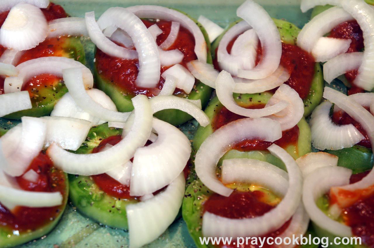 Just about the time I was discovering a great fondness for Fried Green Tomato Parmesan, Mary at Deep South Dish posted a fabulous looking recipe for Green Tomato Casserole. What interested me was the use of green tomatoes that aren’t fried. When I made the Fried Green Tomato Parmesan, I didn’t think about using the green tomatoes without being battered and fried first. I found Mary’s casserole very curious. Since I still had a little bit of marinara sauce to use up, t