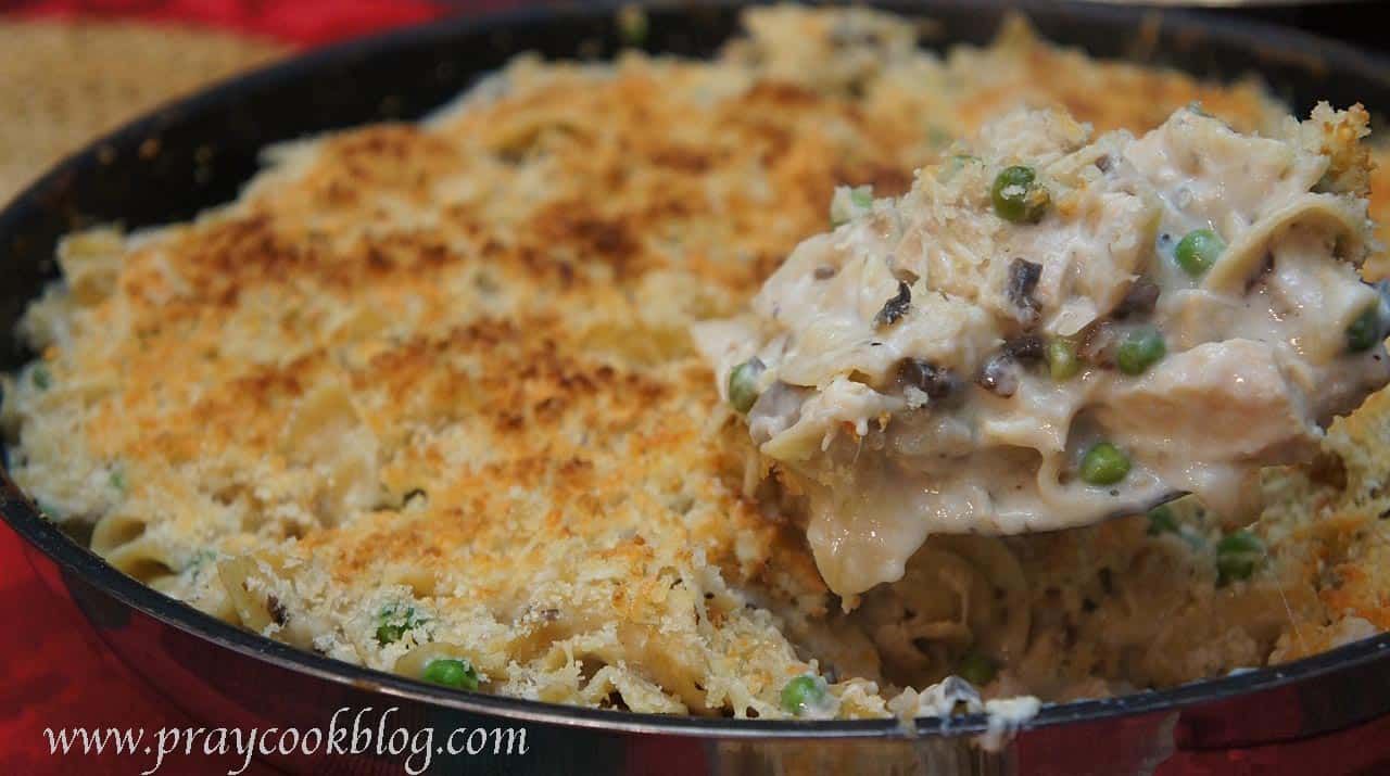 - Stir in tuna, peas, and ½ cup Parmesan until evenly incorporated. Stir in cooked noodles -- the pan will be very full! Remove from heat.