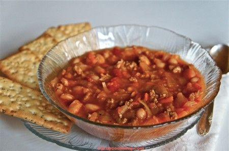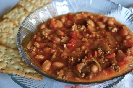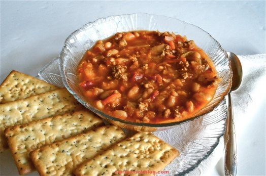 May use ground beef or ground turkey. Ground turkey contains less fat and makes a leaner soup.