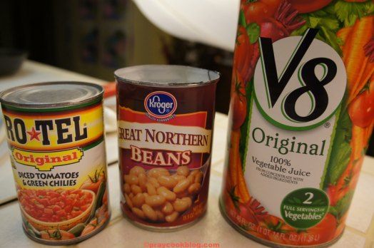 Now, here is where it gets interesting. V-8 juice, white beans, and Ro*tel tomatoes!
