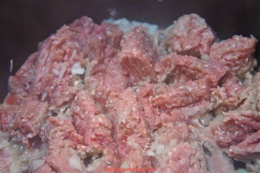- Cook ground meat and onions until fully browned. If cooking beef, drain. If cooking turkey, no need to drain.