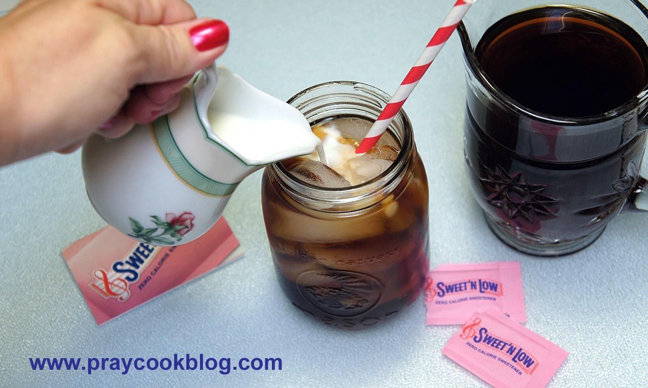 I filled a mason jar with ice. (I was delivering this to him out in the shop and a mason jar fit the decor perfectly.) The newly made cold-brewed coffee was next. Then I added two packets of Sweet ‘N Low which is about 1/2 teaspoon and 2 tablespoons of 2% milk. I gave the whole thing a little stir and sipped a little taste. WOW, this is good — even for a non-coffee drinker like me!