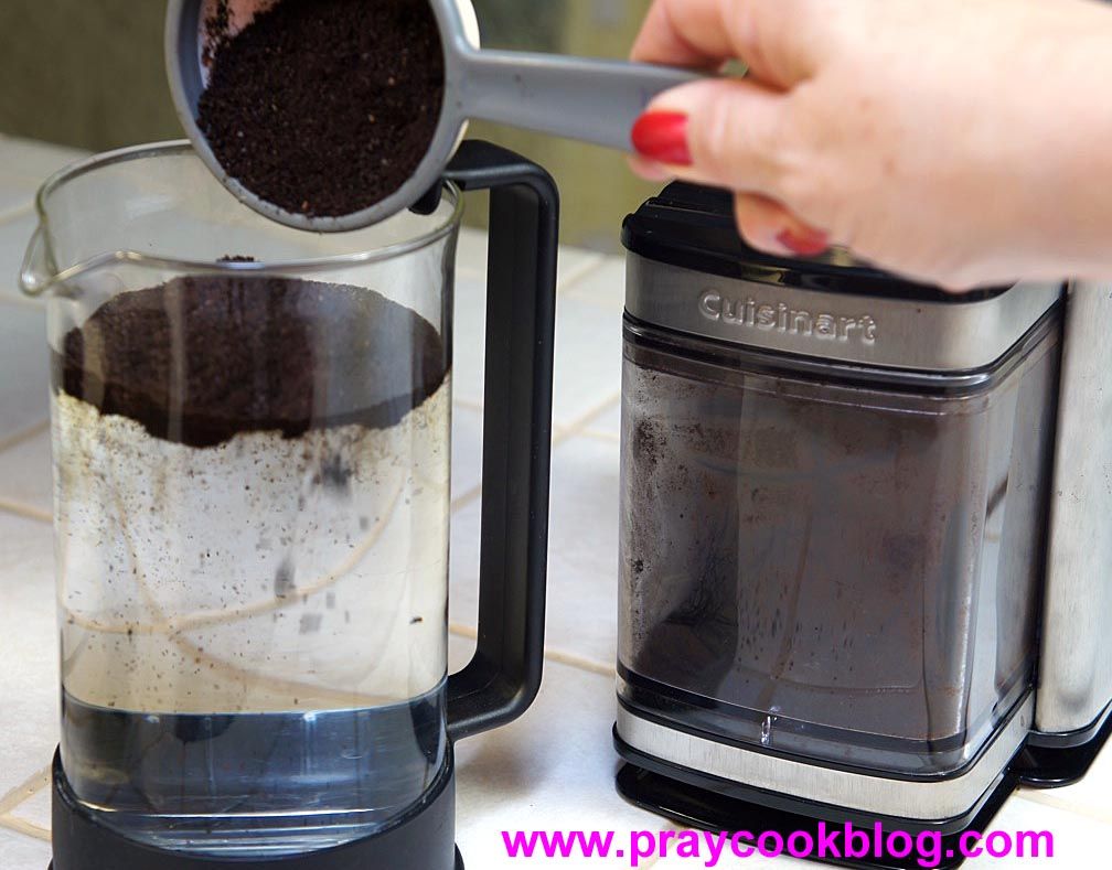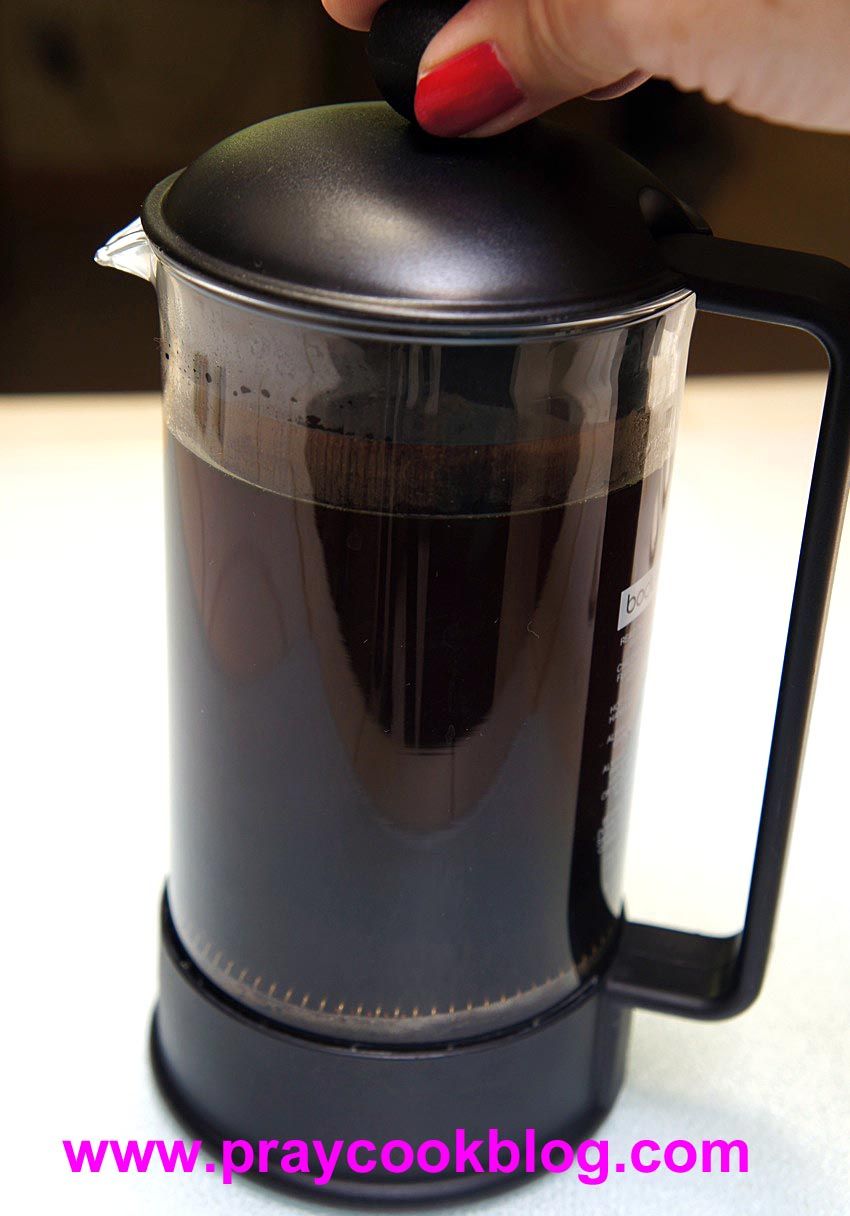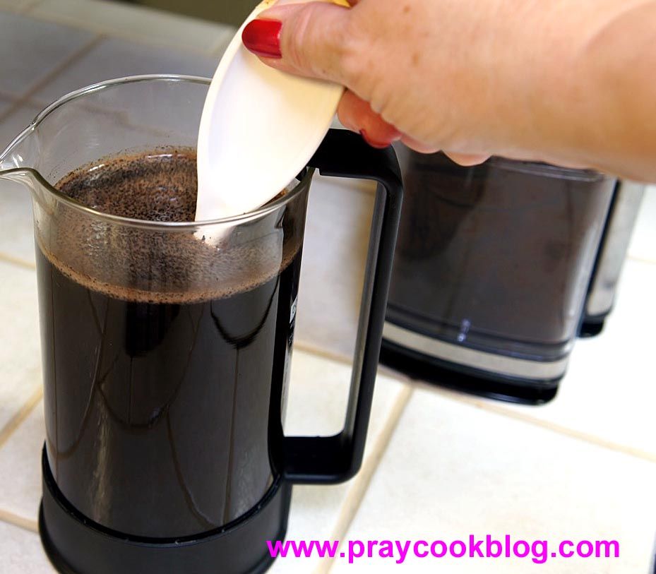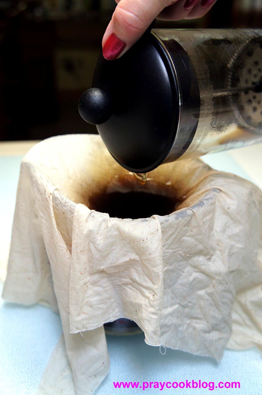 When talking to Sue about this step she said, “uh, why don’t you just use a coffee filter?” Duh. Why didn’t I think of that? Okay, use cheese cloth, a piece of muslin OR a coffee filter 🙂 Because I had used the french press first, when I poured this through my muslin filter there was very little sludge and grounds left to filter. I just poured this off into a glass measuring cup. The results … pure, delicious, liquid gold!