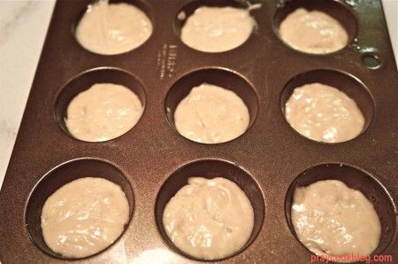 - In a separate bowl add the flour, baking powder, baking soda, nutmeg, cinnamon, and salt. Stir the wet ingredients into the dry ingredients making sure everything is thoroughly combined. Spoon the batter evenly into the prepared pans, filling each cup ¾ full.