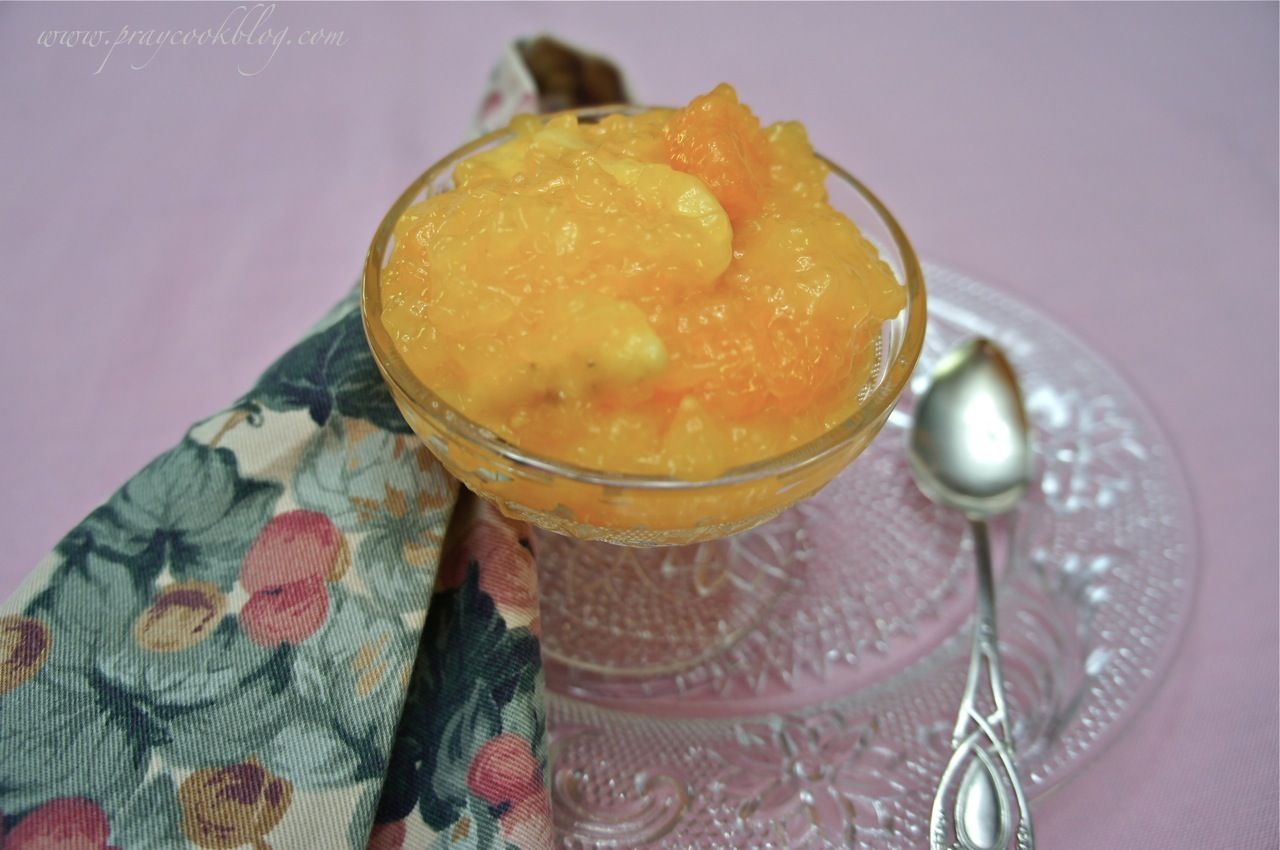 - Drain oranges and pineapple saving juice. Add enough water to the juice to make 3 cups. Mix with pudding and cook for 1 minute after it comes to a boil.