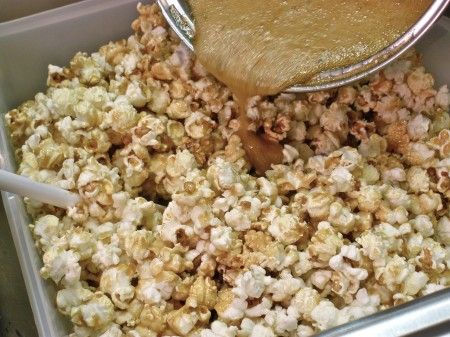 - Pour mixture over the popped corn. Mix well and lay in a single layer on baking sheets.