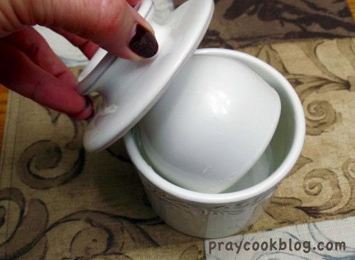 - Pack 1/2 cup softened butter FIRMLY into the bell-shaped lid.