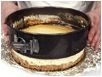 4. Unclip the clasp at the side of the pan, watching for any areas that stick. Carefully lift the outer ring over the top of the cake. If you used a plain cake pan and don’t want to serve dessert in the pan, invert a plate covered with a sheet of waxed paper over the pan. Tip the cake pan over the plate, and remove the pan. Invert a serving plate over the bottom of the cheesecake, and flip it over. Remove the top plate and paper, trying not to peel off the “skin” on the surface of the cheesecake. Any imperfections can be covered by chocolate ganache, a fruit sauce, or a layer of lightly sweetened sour cream.