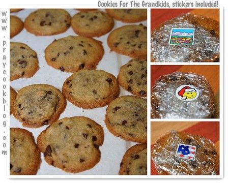 Since these cookies are going to the “kids” young and old, we decided to add some sticker fun. We individually wrapped the cookies so they can sit on the counter in Grandma’s cottage and the kidlings can come and get one anytime they want. (Sorry moms and dads, this is Grandma’s week to rock with the grandkids and great nieces and nephews!)