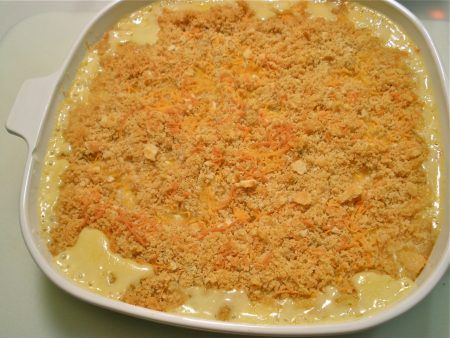 - Pour the mixture into a slightly greased 9x13-inch baking dish. Mix together the crushed Ritz crackers and the melted butter until add the crumbs are moistened, then sprinkle over the top of the pasta mixture. (Pulsing on and off in a food processor will crush your crackers nicely and then it is easy to add the butter too!)
