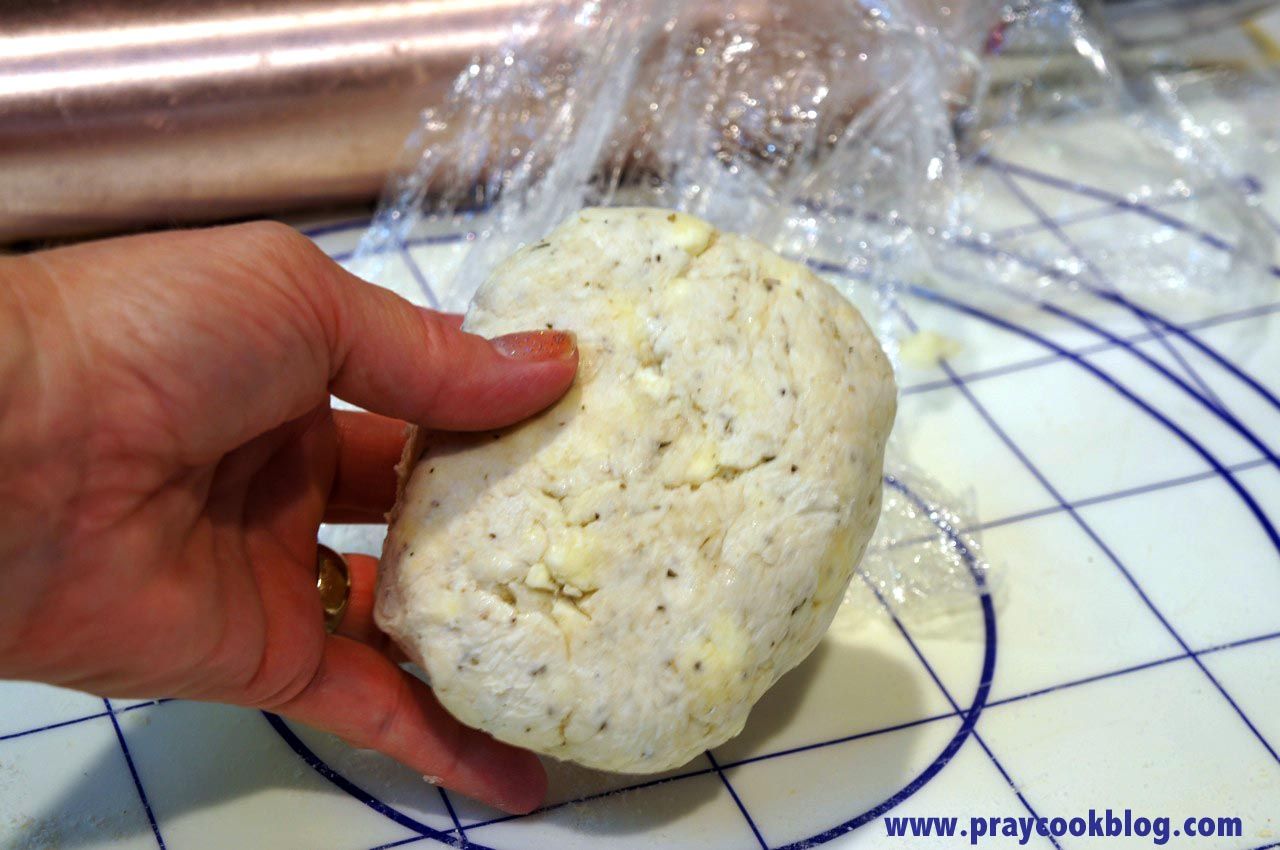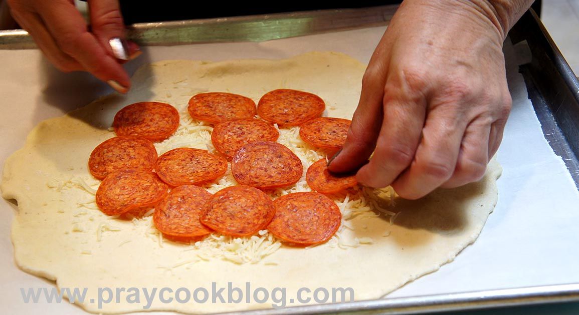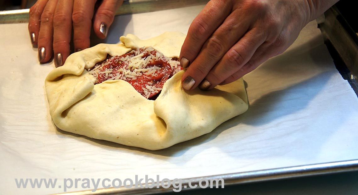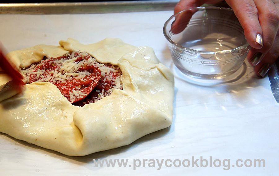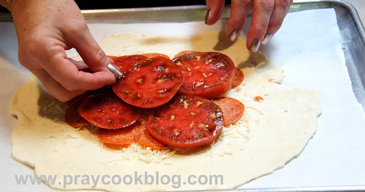 Galette is a term used in the French cuisine to designate various types of flat, round or free form crusty cakes. In American cuisine we think of a “cake” as sweet, but with the galette it can be sweet, such as my Triple Berry Galette, or savory such as this Italian pepperoni and tomato galette. In this case it is more like a pizza pie. The lovely dough starts out with yogurt or sour cream mixed in ice water. Flour, cornmeal, Italian seasonings, and a pinch of sugar is mixed together. The dry mixture is blended with butter to make the incredibly flaky rustic tart dough. The wet and dry are mixed together and placed in the refrigerator for 2 hours to 24 hours. Italian seasonings can be added to the dry mixture for added flavor. You will see little pieces of butter within the dough. This is okay. When little pea-size pieces of butter are not totally mixed into the dough, it will produce a very flaky layered galette when baked. The dough is easy to roll. When making this Italian galette, I sprinkled a generous amount of cornmeal under the dough as I rolled it. This keeps it from sticking making it much easier to move to the prepared baking pan. The dough is rolled into about an 11″ circle. Not to worry if it isn’t exactly a “circle”. This is a rustic free form pie and can take on any shape you want. I lay the dough on a parchment lined baking sheet. Italian blend cheese is sprinkled on the dough, leaving a 2″ border free of cheese. Pepperoni slices are added. The pepperoni is topped with sliced tomatoes. I used these purple heirlooms, but Roma’s would be great too! A little more cheese and some Parmesan cheese can be sprinkled across the tomatoes. The 2″ border is then folded around the pie. The dough will pleat naturally as it is folded in towards the middle. Brush water across the pastry dough and then sprinkle with a bit of kosher salt. Into the oven it goes for about 35 minutes. Once the dough comes from the refrigerator this only takes a few minutes to put together. It can be served hot out of the oven or at room temperature. The cornmeal helps give this a crispy crust that is so delicate and yet sturdy enough to hold the cheese, pepperoni, and tomatoes. Unbelievably good!