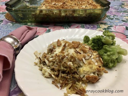 Although lately, she has had trouble finding the exact rice called for in the recipe which is Rice-A-Roni Fried Rice with Almonds. I couldn’t find that exact flavor and so I used a mixture of one box chicken and garlic and one box chicken and broccoli. Whew! I highly recommend the chicken and garlic. The garlic creates a flavor layer that really adds to the overall taste of the casserole. The broccoli gave me that false sense that I was eating healthy! 😜