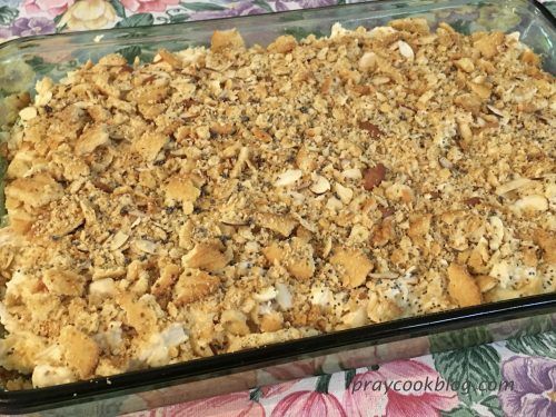 Mix the cooked chicken with soup and sour cream for the next layer. Crushed Ritz crackers and poppy seeds top the chicken layer. Lila’s recipe calls for a cup of melted butter mixed with the crushed crackers. I omitted the butter and sprinkled the top with slivered almonds. Oh my goodness! Can you just taste it now?