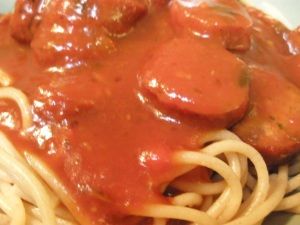 I like spaghetti sauce thick enough to “stick to the spaghetti” when served. Years ago someone told me to be sure and put some oil in the water when cooking pasta, so it won’t stick together. I think this is bunk for several reasons. I don’t believe it prevents pasta from sticking together, it adds unnecessary calories, and it keeps the sauce from clinging to the pasta. For these reasons – no oil in my water! Also, make sure your pasta is well drained, so it doesn’t add extra liquid.