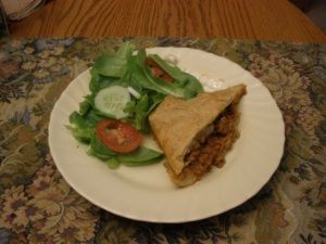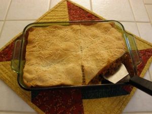 Line a 9 x 13-inch pan with 1 can of rolls (you may have to press and stretch to cover pan). Cover with the meat mixture. Put second can of rolls on top, again stretching dough. Bake 20-25 minutes at 350 until golden brown.