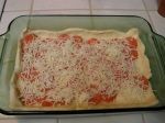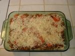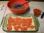 Layer meat sauce, the other half of the pepperoni slices, ½ of the cheese mixture,