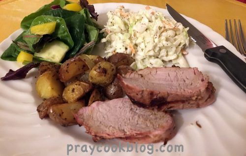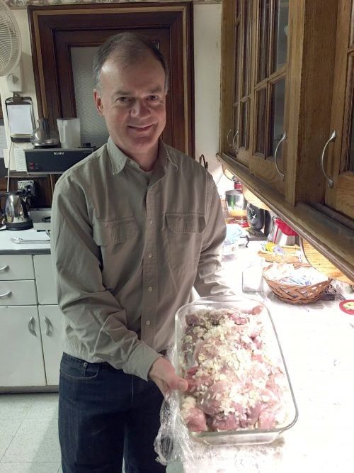 Russ didn’t need to go searching for the recipe card. He quickly assembled the dish as we talked and laughed about the meal to come. Here is what you will need to get the same 5-star meal we did: 24 hours, pork loin, salt, pepper, onion, garlic.