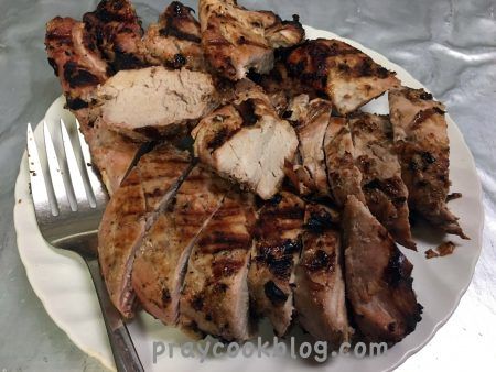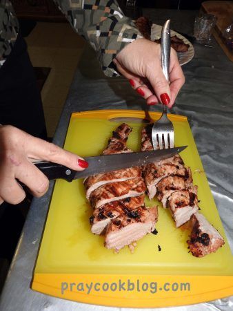 24 hours later the meat is removed from the marinade and the grill is heated to 350 degrees F. The meat cooks pretty fast in 30 to 40 minutes depending on the thickness of the loin. My job was simply to photo-bomb Russ’ fine grilling!