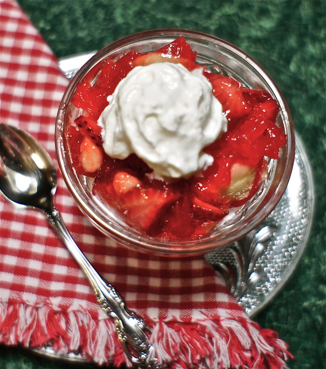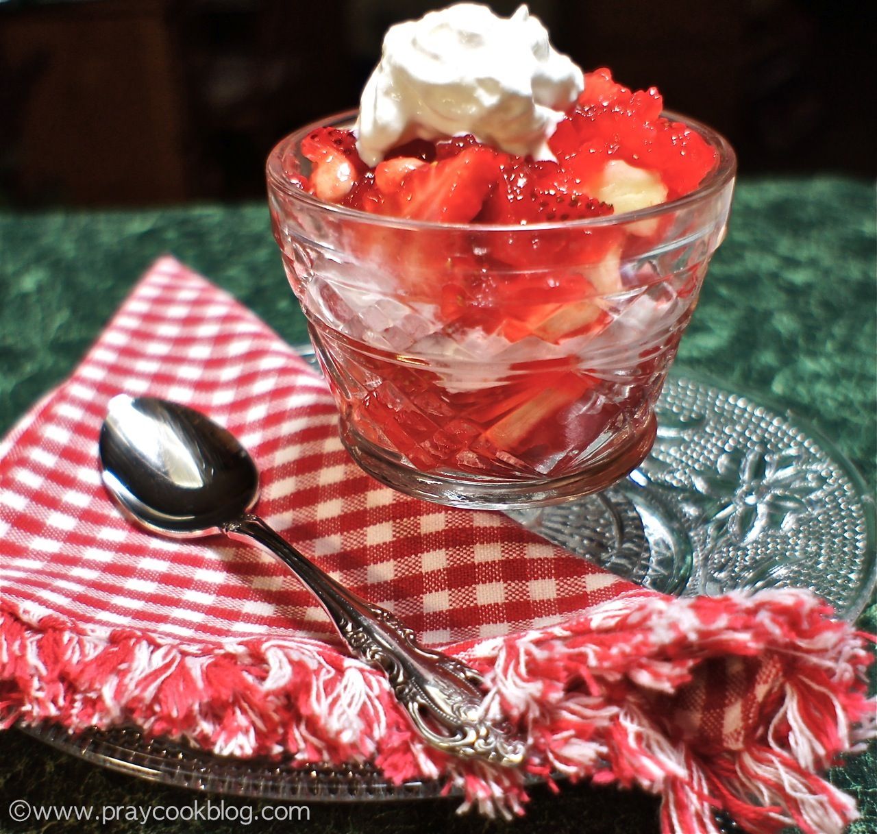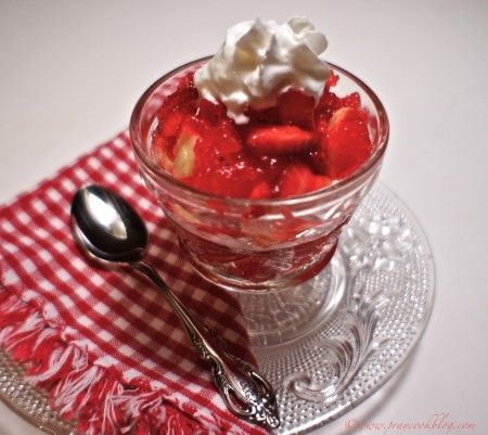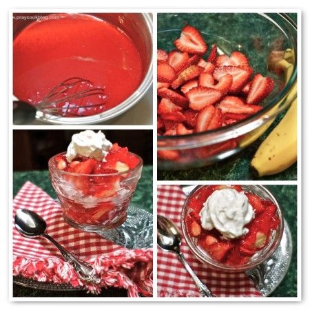 Start with a dollop of whip cream, add some strawberries, bananas, and layer between good amounts of the thickened strawberry filling. Refrigerate for 30 minutes to a couple hours. Top with some whipped cream and serve to your happy family!